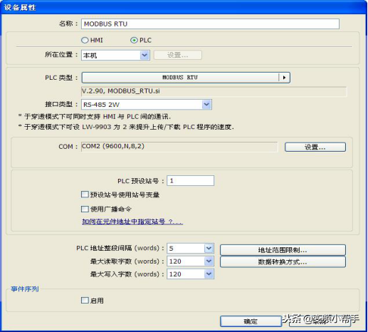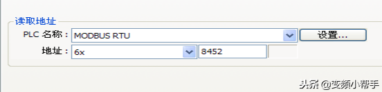 1、触摸屏与变频器通讯参数设置:MODBUSRTU格式、9600,N,8,2