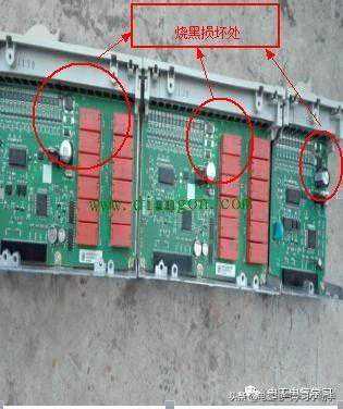 做好安全措施后,将PLC模块解体,发现2块PLC开关量输入输出模块元器件烧损发黑、1块PLC开关量输入模块元器件烧损发黑(如图),由此可以判断,输入、输出模块损坏意外损坏。