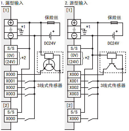 DC电源型的漏型(NPN)输入和源型(PNP)输入接线如下图。