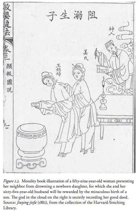 本书主体分成五章,分别讲述了关乎女婴命运的不同人群的故事。第一章“决定一个孩子的命运:女性与分娩”围绕着参与杀婴过程的女性,包括产妇、接生婆、婆婆等。作者着力分析了一名叶姓妇女(1567-1659)自述的早年溺死才呱呱坠地的女儿的经历。值得一提的是,这种分析下的杀婴,不是一种在事后要被谴责或怜悯的行为,而是事件中一个有待作出的决定。产妇经常是在复杂和艰难的情况下终结亲生女儿的性命。在她们眼中,生育男孩意味着将来有可能过上舒适的生活,并在家中赢得尊敬;而生育的女儿将来可能还要像自己一样受苦受难。而且,杀死女婴的决定可能也不是产妇个人的主意,分娩中在场的其他妇女,比如接生婆、婆婆、邻居大妈等都可能在其中扮演或积极、或消极的角色。在民间想象中,虽然杀婴可能导致的报应令人胆寒,但是如果此举不是生母的初衷,而是迫于如婆婆这样的家中长辈的压力不得已而为之,生母仍会被视为恪守孝道而不被追究。