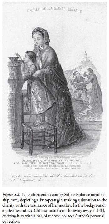 第四章“拯救灵魂:传教士和救赎”考察了法国圣婴会是如何在世界范围内、特别是欧美天主教会的学童中间,传播中国的杀婴问题。圣婴会于1843年成立,旨在支持海外的传教士对异教儿童进行洗礼以拯救他们的灵魂。这在信奉天主教的西方儿童看来,是一项非常神圣的事业,因此很多儿童慷慨解囊,定期捐款以推进这项事业。而中国婴儿被抛弃或杀害的印象,也随着圣婴会在全球范围内的扩张而不断加深。附带提一下,作为本章引子的故事发生在1872年的加拿大法语城市魁北克城(QuebecCity),约有三千名当地儿童兴致勃勃地参加了由圣婴会组织的演讲活动。笔者想起曾看过的一部纪录片《在魁北克的中国人》(ÊtreChinoisauQuébec,2013),其中一位接受访谈的当地老先生谈到,直到20世纪六十年代,传教士还会到其所在的学校告诉孩子们,包括中国在内的一些贫穷地方的儿童需要帮助。年幼的他相信,能够帮助更多的中国小朋友,就证明他是更好的天主教徒。不难想象,这种从孩提时代起就接受到的信息,将会持续影响很多国外普通百姓想象中国人对待婴儿的方式。本章的阅读可以结合沈艾娣(HenriettaHarrison)在2008年发表的论文,很多分析都呼应了沈氏的观点,展现了圣婴会是如何有效地动员儿童。本章的贡献主要体现在作者使用了更为广泛的文字和图片资料,这些资料此前未曾被讨论过,其中有一些为作者的个人收藏,颇为珍贵。