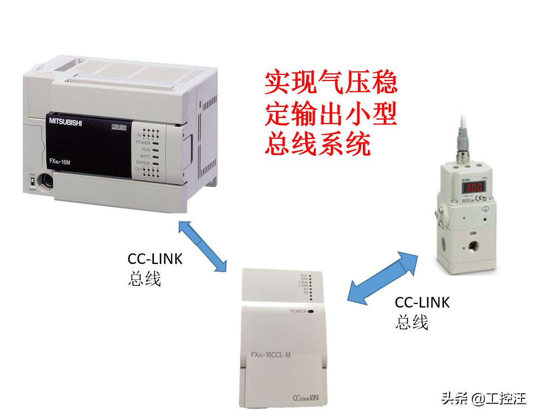 举例说明:如何通过FX3UPLC链接一个具有CC-LINK通讯的电气比例阀,实现PLC可以控制比例阀的输出气压的小型系统(举例不易,老铁们多多点赞);需要采用一个FX3U-16CCL-M的CC-LINK主战模块将PLC做为主站模块;电气比例阀是一个可以实现输出气压稳定调节的装置,是一个闭环系统;