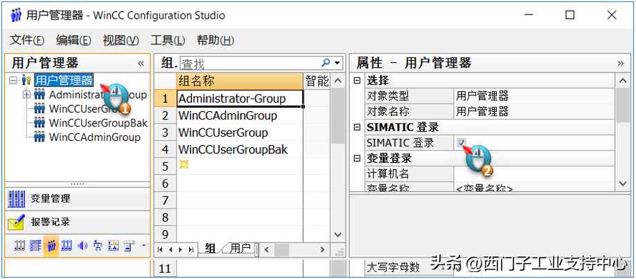 在WinCC的用户管理器中单击“用户管理器”,然后在右侧属性窗口中勾选“SIMATIC登录”。如图2-1所示。