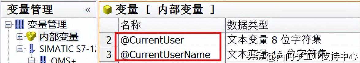 在WinCC中使用内部变量@CurrentUserName和@CurrentUser可以显示当前登录的用户名称。如图2-2所示。