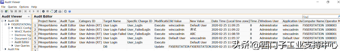 在WinCC的Audit数据库中,AuditEditor中也会记录尝试操作AuditEditor的用户动作信息。如图2-7所示。