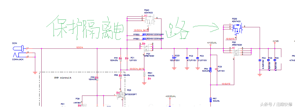 从主板实物及时序图上分析,从DC12适配器接口检查主板保护隔离供电即+V12S供电,打PQ2输出端第8脚,对地值300欧为正常,万用表量第8脚输出电压12V也是好的。实物图与原理图如下:
