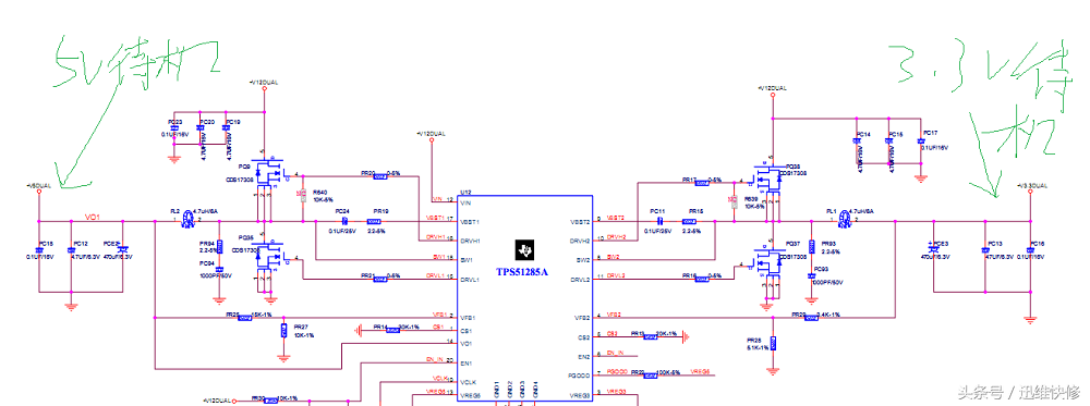 此电路由PL3PU1AOZ1237微型PWMIC或DRMOS芯片产生。供电上芯片第21脚VCC5V电压为0K,B1脚+V12S电压也0K,但是第2脚EN电平为0V。