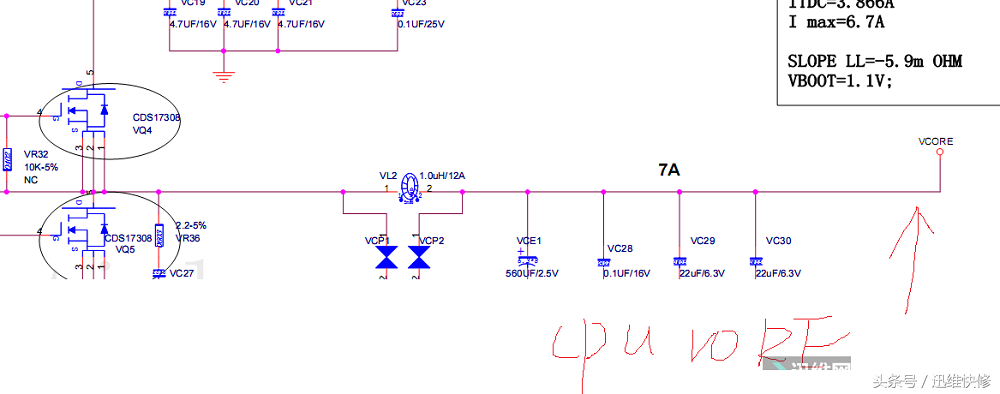 此电源芯片为PU7ISL95833,查芯片第2221脚VCCP与VDD上+V5S供电输入OK,查第2脚VR_ON开启信号为0V,主板断电后打此信号阻值320欧正常。附实物和原理图如下:EN信号由+1.05V_PWRGD经VQ2VQ1管子转换而来。示波器量VR530欧电阻为0V电压,原来是工控主板南桥与CPU总线供电无引起的无CPUVOREEN信号。
