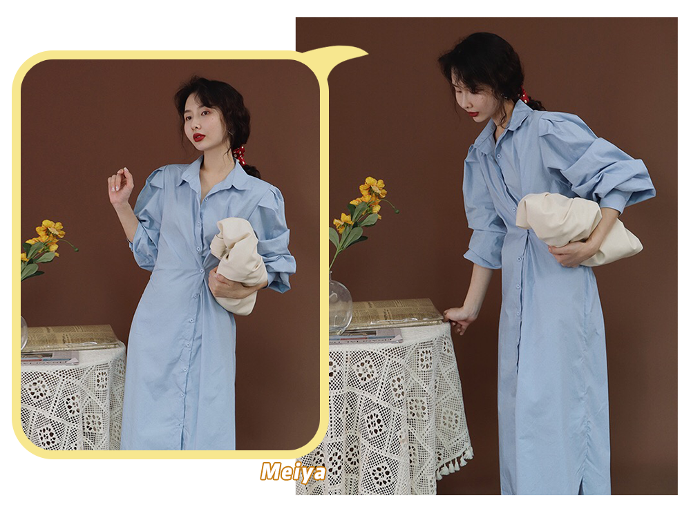 衬衫裙之所以受欢迎,很大程度是因为它能够很好遮盖我们的一些身材上的缺点,无论是手臂、大腿,还是肚子上的小肉肉都能一“件”隐藏。像娜比的这一件,袖口还有一些设计,就显得更为特别。