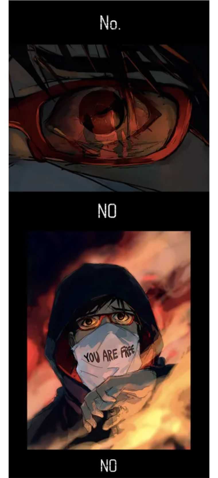 其次不停滚动的屏幕自然地模拟出定格动画效果,这使得长条漫画非常适合表现事物的连续变化,如模拟角色视线的移动,表现激烈打斗场景,或者角色心境或事物状态的缓慢变化(长镜头效果)。