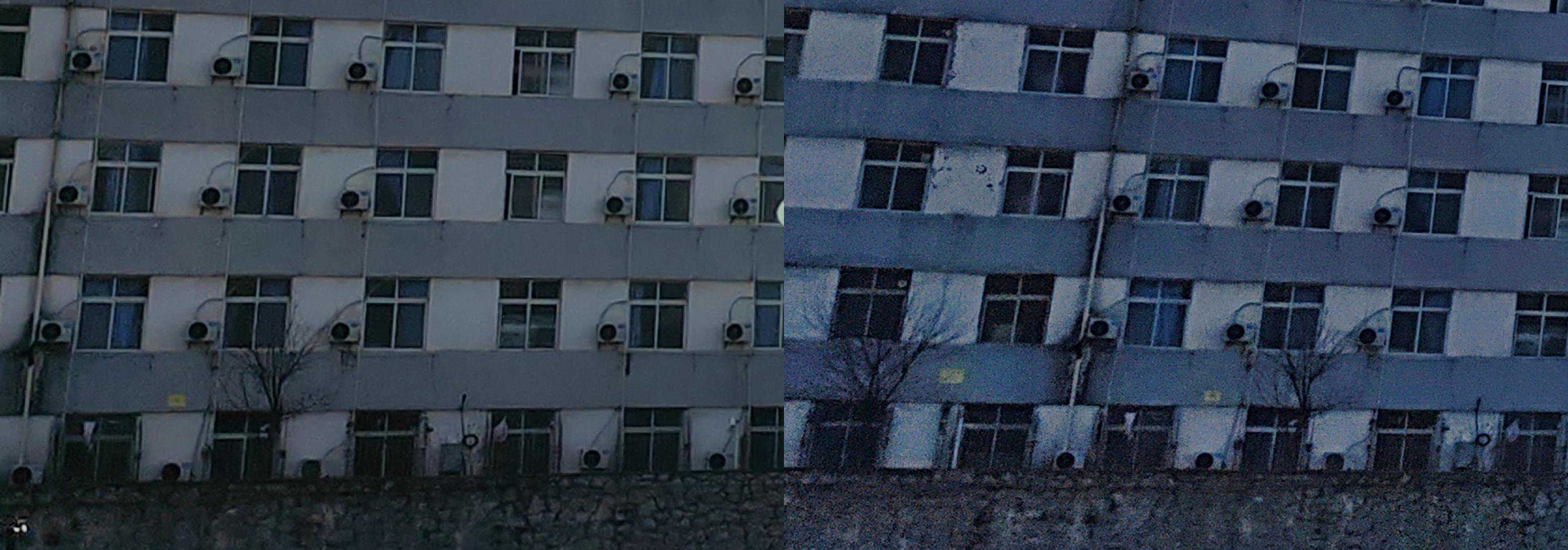比如将左下角的局部进行放大,左侧为荣耀,右侧为iQOO。荣耀的呈现很稳,但是iQOO有明显的色差,且噪点很多,清晰度下降。