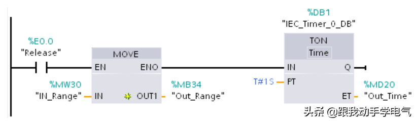 在STEP7V11中,系统不允许带有EN参数的指令块与其他指令块相互并联。的LAD/FBD编辑器中t也不允许此种编程。但是,您可以将“MOVE”指令的ENO参数串联到接通延时定时器的IN参数上。