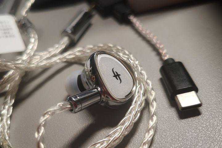 DEW3本体由铝合金喷砂制成,表面镭雕工艺,单侧侧面设计了类似散热片的造型。可分离的线材为无氧铜与镀银混编材质,柔软程度较高。