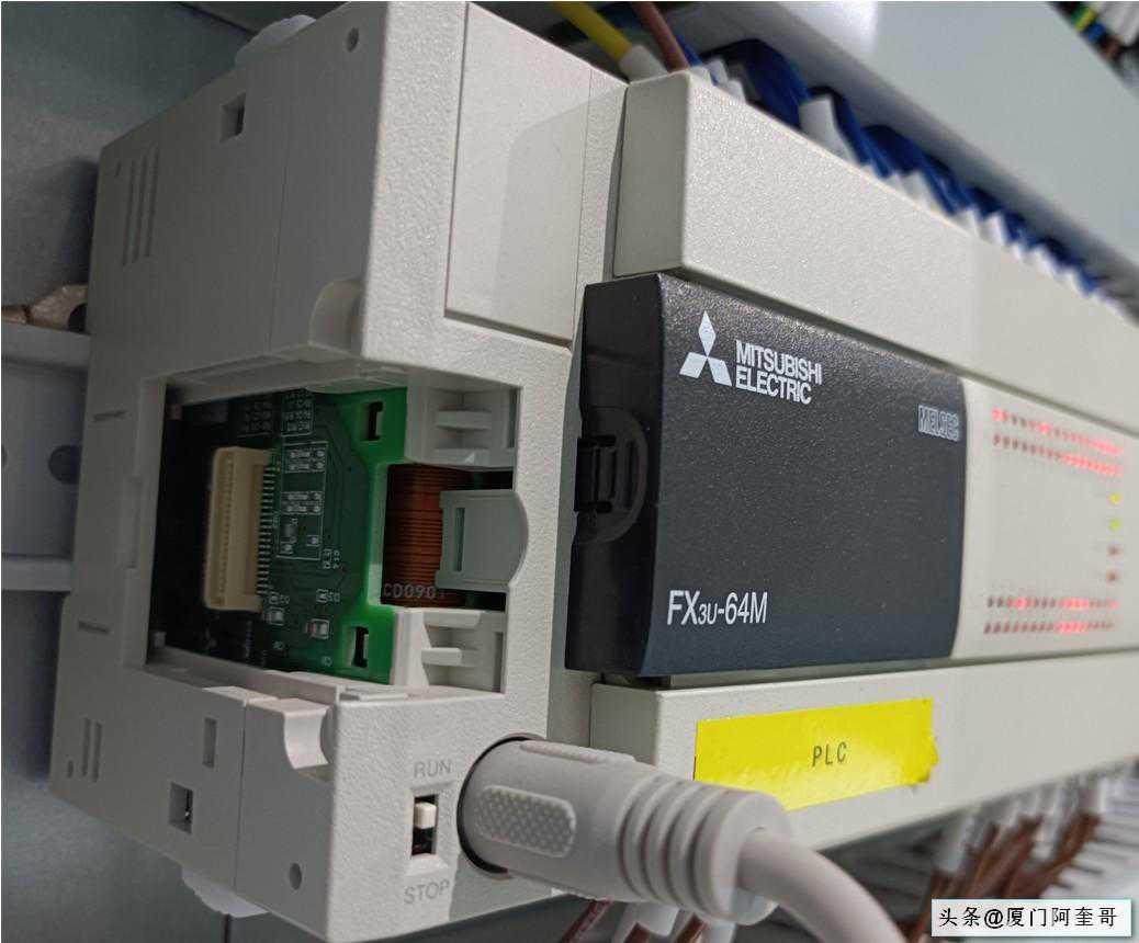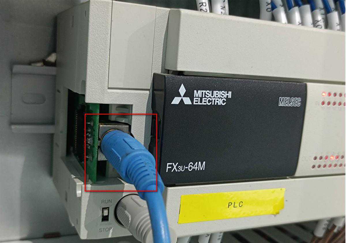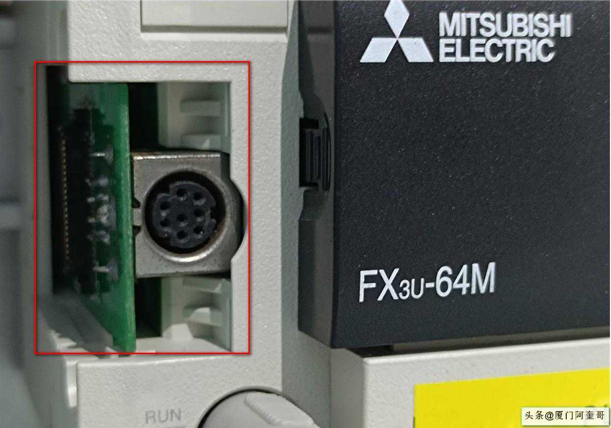 接下来我们把三菱编程线插在新增的FX3U-422BD板的插口上,进行通信测试。