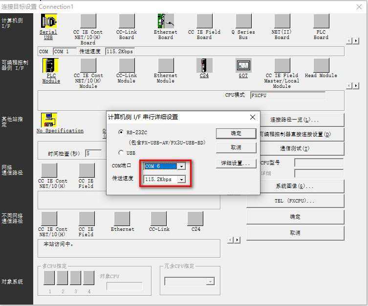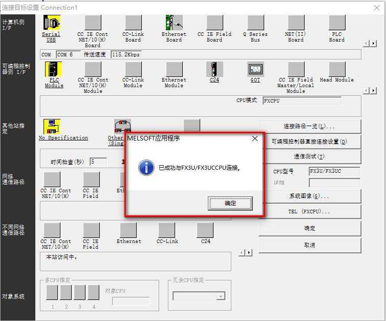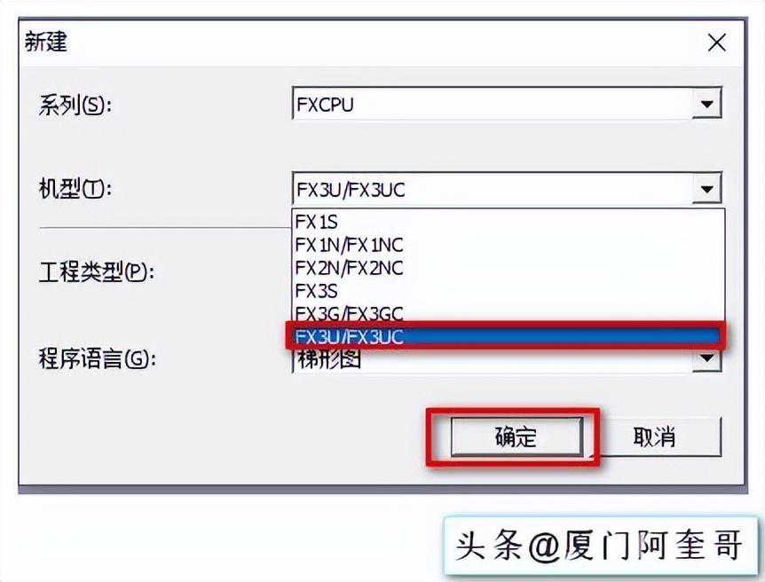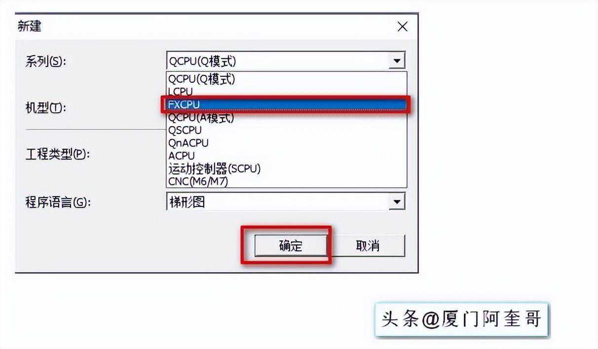 在弹出来的对话框中,选择机型“FXCPU”。