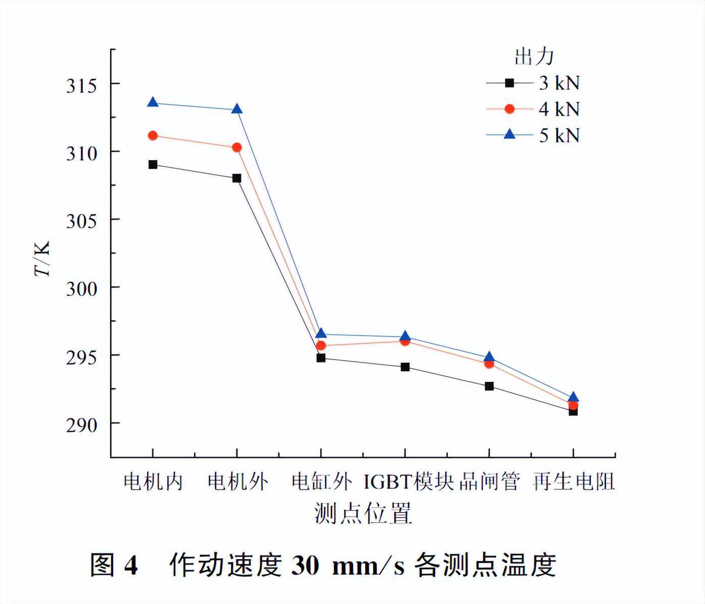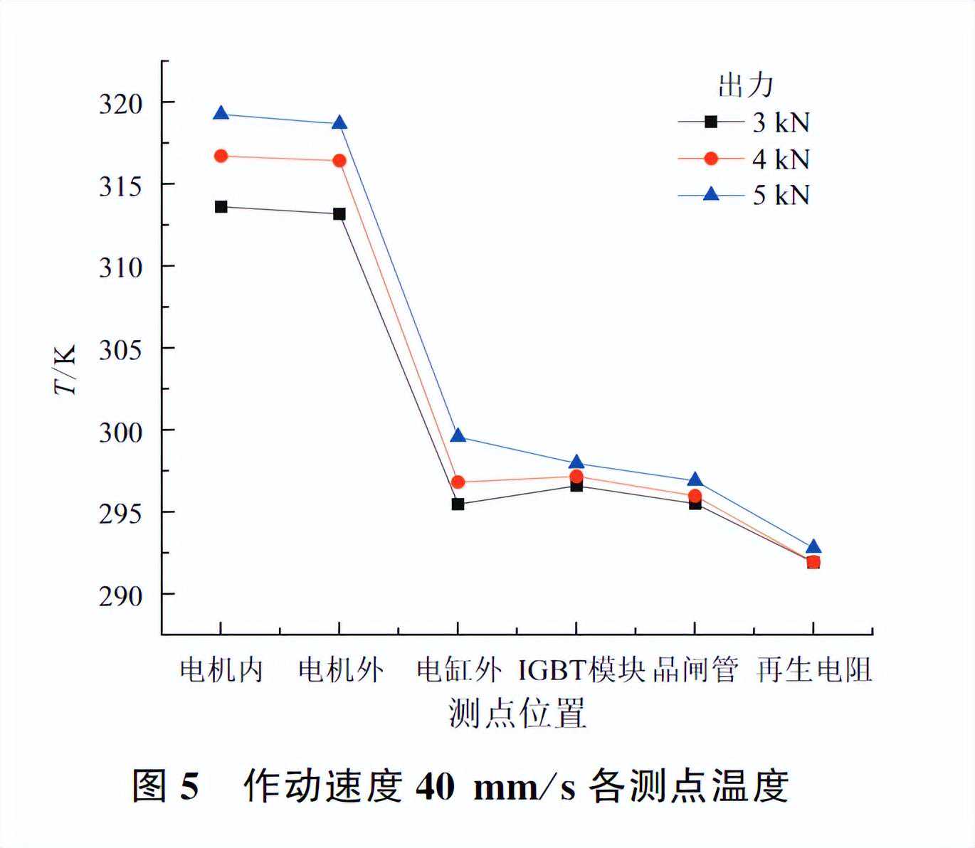 由图3-图5可知,机电作动器温升最明显的部件为永磁电机,其稳态温度随作动速度与出力的增大而显著升高,在已测试的工况下最高约为320K,温升接近20K;温升次明显的部件为伺服驱动器IGBT模块,最高约为298K;最大温升为3K。