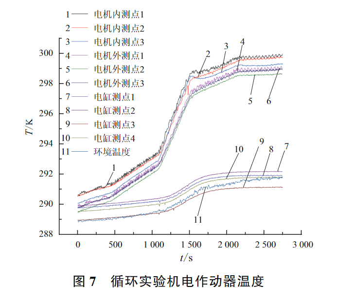 由图7知,机电作动器的永磁电机在高作动速度、大出力的阶段内温升极为迅速,尽管其热容量较大,在5min内温度仍升高了约7K;由于永磁电机采用自然对流的方式散热,其散热效果较差,在循环实验其他阶段内温度也处于持续上升的状态。