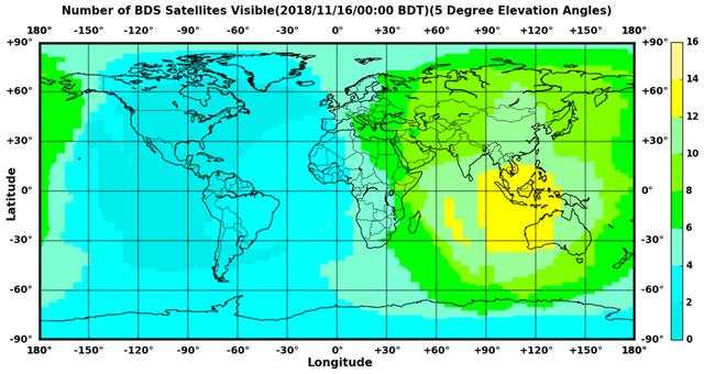 2018年11月16日北斗卫星全球可见情况,目前亚太地区已经逐步点亮,全球建网仍在进展中(图自:)