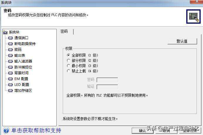 如图所示的系统块对话框允许为S7--200组态密码。S7-200的缺省设置是“完全”(1级),没有任何限制。