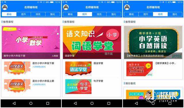 虽然学习的课本是一样的,但是学生中总会有个体差异,有的人学习的慢,有的人很快就可以掌握,现在有了CLASSONE学习手机,可以针对不同的学习情况,分层教学因材施教,这里将辅导内容分为了四个不同层次的班级,基础班、提高班、培优班、强化班,学习速度较快的在掌握基础的基础上,也可以进行提升,当然学习速度慢的学生也不必为跟不上老师进度烦恼,可以在业余时间,继续学习。