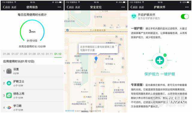 即使孩子用手机突破限制做了某些事情,我们也可以从使用报告里面查看,这里体现了每天应用的使用总时长,可以查看每天的报告,也有没有应用单独的使用时长,我们也可以根据这项发现孩子的需要改进的习惯,除此之外目前很多针对孩子的设备都有的定位功能,也被单独设置在这里,可以查看孩子的实时位置,偏差并不是很大,如果是室内有几十米的偏差,室外可以做到个位数的偏差,但是遗憾的是还不能查看孩子的移动轨迹,护眼功能也可以在这里开启和关闭,在孩子长时间使用手机的情况下,如果没有打开护眼,家长发现后可以远程开启。