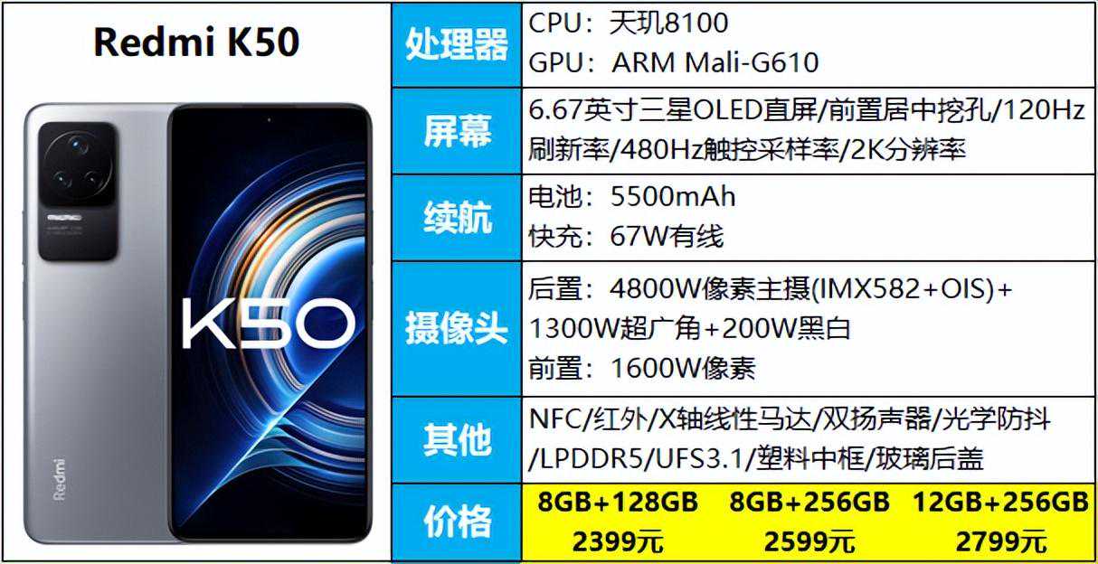 RedmiK50这款手机最主要的卖点就是2K直屏+天玑8100处理器+5500mAh大电池了,这应该是你能买到的最便宜的2K屏幕的手机了。