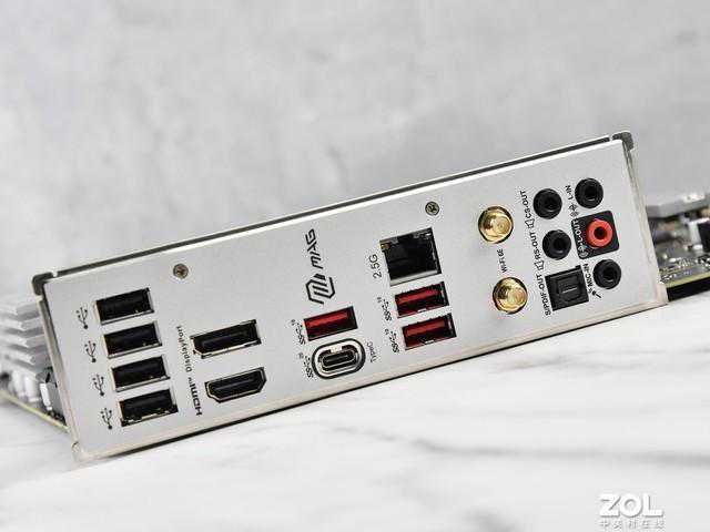 微星B760M迫击炮2代主板预装了I/O装甲,提供4个接口,3个3接口,一个接口,一个HDMI接口,一个DP接口,一个2.5G有线网口和一个Wi-Fi6E天线接口以及5个音频接口。