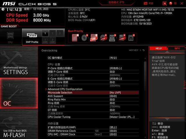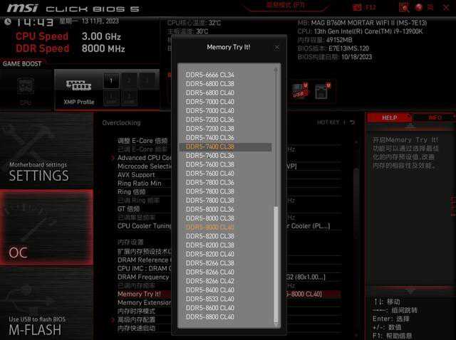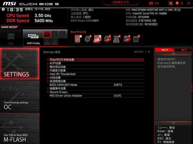微星B760M迫击炮2代主板因为在14代酷睿之前发布,所以需要更新最新BIOS才能使用14代酷睿,不然就会卡自检。这款主板BIOS依旧是微星经典设计,主菜单页面可以对XMP等重要功能进行快速设置,也能查看硬件参数。
