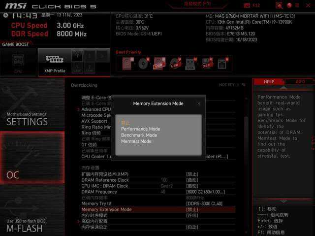 这次微星增加了一项MemoryExtensionMode内存带宽模式的选项,这个选项提供了3种模式,分别为PerformanceMode性能模式,BenchmarkMode跑分模式以及MemtestMode极限模式,开启后根据模式优化内存小参,增强内存性能,不过对内存压力的也会变大,需要酌情开启。