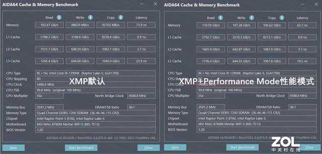 可以看到PerformanceMode性能模式对于内存提升非常明显,毕竟优化了小参,所以能让XMP内存读写和延迟进一步提升。PerformanceMode性能模式和BenchmarkMode跑分模式增幅相近及MemtestMode极限模式增幅最大,有兴趣的用户可以尝试,毕竟是白嫖的性能。