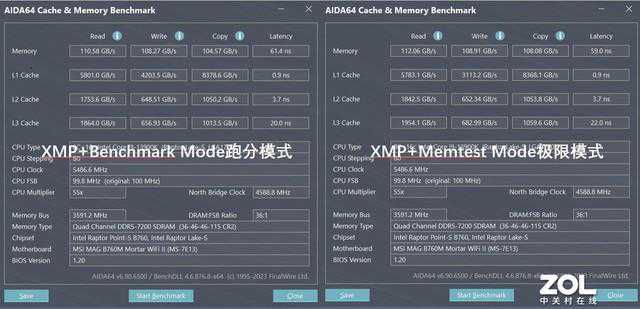 我们首先进行一下内存测试,首先我们这次来测试一下MemoryExtensionMode这个功能,看看XMP7200MT/s的内存在这项功能下有什么性能变化。