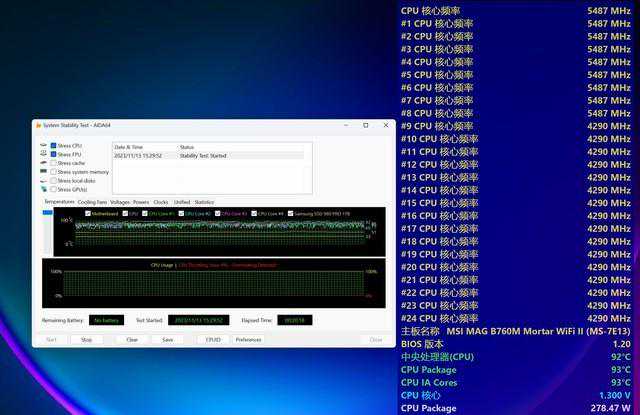 拷机20分钟,通过降压,微星B760M迫击炮2代主板可以让酷睿i9-13900K保持性能核全核心5.5GHz能效核3.3GHz的满睿频拷机,功耗降到了278w,温度在93℃,降压后完全能让这款旗舰级13代酷睿性能充分发挥。