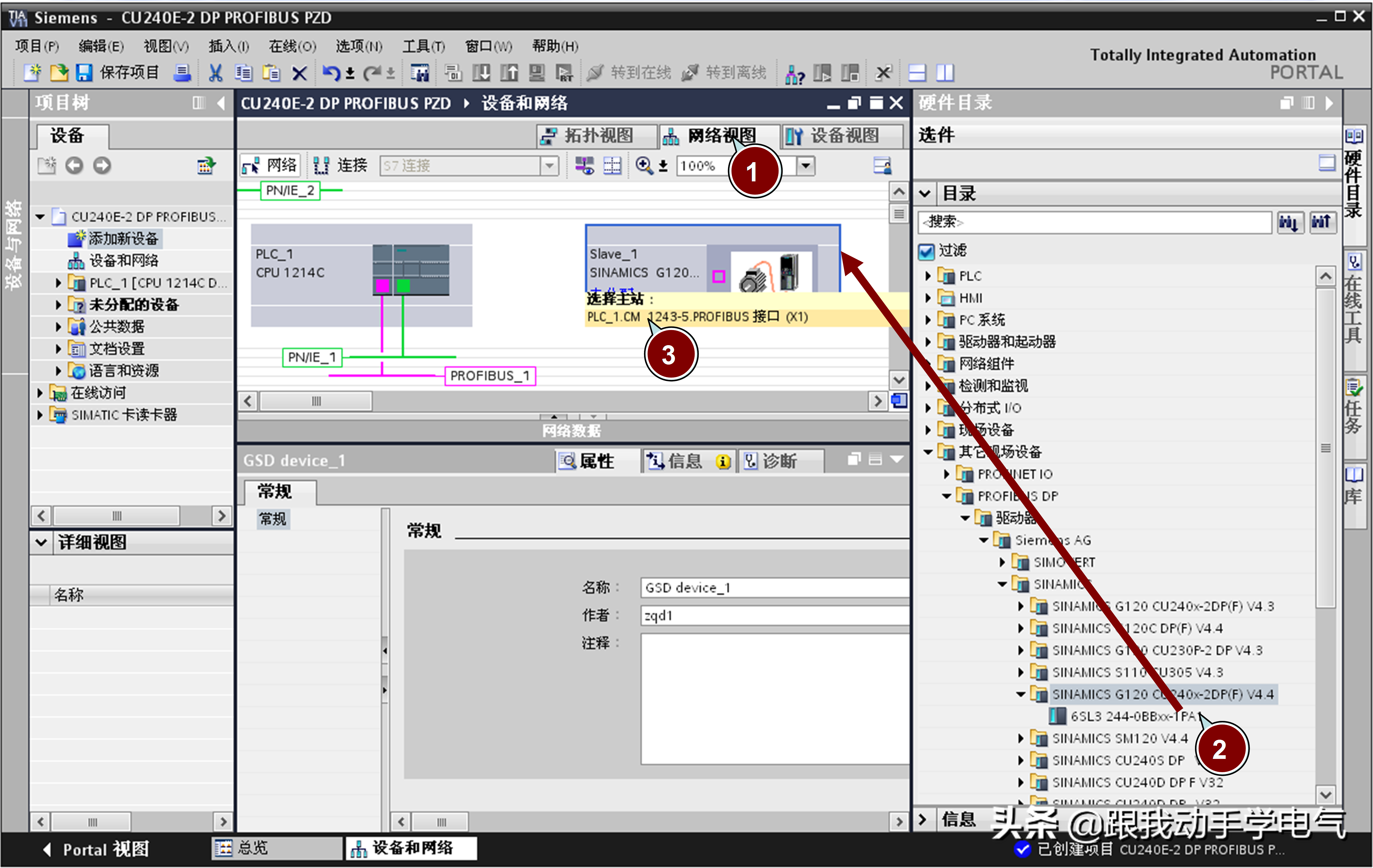 S7-1200硬件组态图1创建S7-1200项目图2添加S7-1200CPU1214C图3添加PROFIBUS主站模块CM1243-5图4添加CU240E-2DPF从站图5分配CU240E-2DPF从......