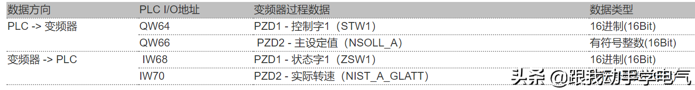 S7-1200通过PROFIBUSPZD通信方式将控制字1(STW1)和主设定值(NSOLL_A)周期性的发送至变频器,变频器将状态字1(ZSW1)和实际转速(NIST_A_GLATT)发送到S7-1200.
