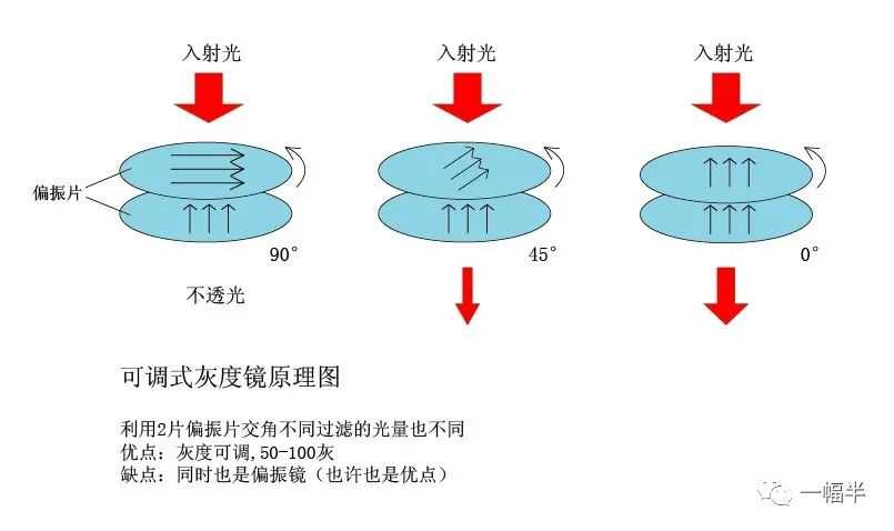 最后,我们重点说一下一个特别的减光镜,就是圆形的可变减光镜。这种减光镜不是涂抹阻光材料而来的,是通过两片偏振片来形成的,通过改变两片偏振片的偏振角度差来实现减光的级别变化。