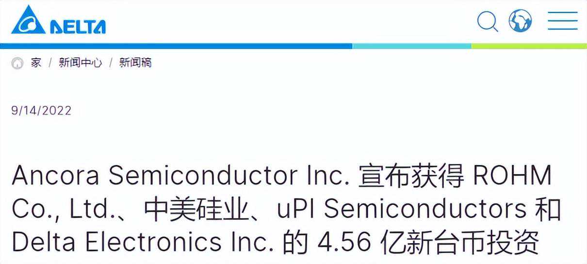 9月14日,台达官网宣布,其子公司碇基半导体(Ancora)已完成新一轮4.56亿新台币(约1.02亿元人民币)的融资,投资方包括中晶美(SAS)、罗姆(Rohm)、台达电子和力智电子(uPI),融资资金将主要用于GaN的研发工作。