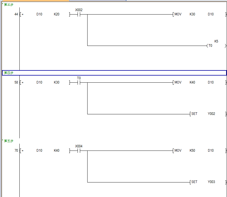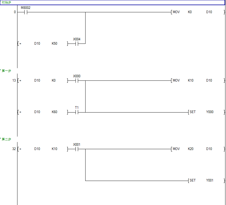 关于顺序功能,其实就是一步一步的进行。拿煮饭的流程为例,先洗米,米洗好,再加水,水加好后开火煮,煮到没有水了,饭就做好了。这个就是典型的单序列的功能图,还有选择序列,并行序列等这些需要你们自己看书就不一一说明了。实现这些的编程方式有太多种了,比如用每个PLC自带的功能图编程指令完成,也有用起保停简单的逻辑编程方式,还有用左移或者右移移位指令编程方式,置位复位指令完成,还有用PLC的加或者减指令完成,传送指令完成等。有很多编程方式是不是全部都要完全掌握呢?其实是不需要全部掌握,但是全部都要了解有这些方式,因为有些方式你不用不代表别人不用。只有都了解了才看懂别人写的程序,你只需要觉得你最方便最容易看懂的最容易后期更改的一种,作为以后写程序的框架。本人推荐用传送指令加置位复位指令完成。如下图所示(以三菱PLC为例,其他PLC可以参照)。这种方式的优点是方便后期的更改程序。客户的需求变了也可以快速更改,不需要删除过多的东西。
