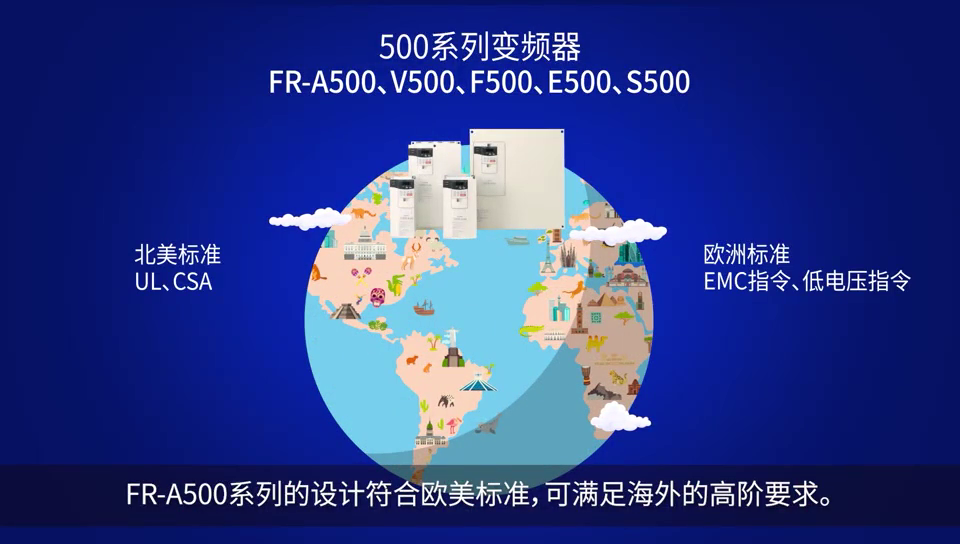 FR-A500系列的设计符合欧美标准,可满足海外的高阶要求。此外,在美国和中国分别设立了生产基地,面向全球销售。FR-E500系列即拥有紧凑的机身,又提高其功能和性能。