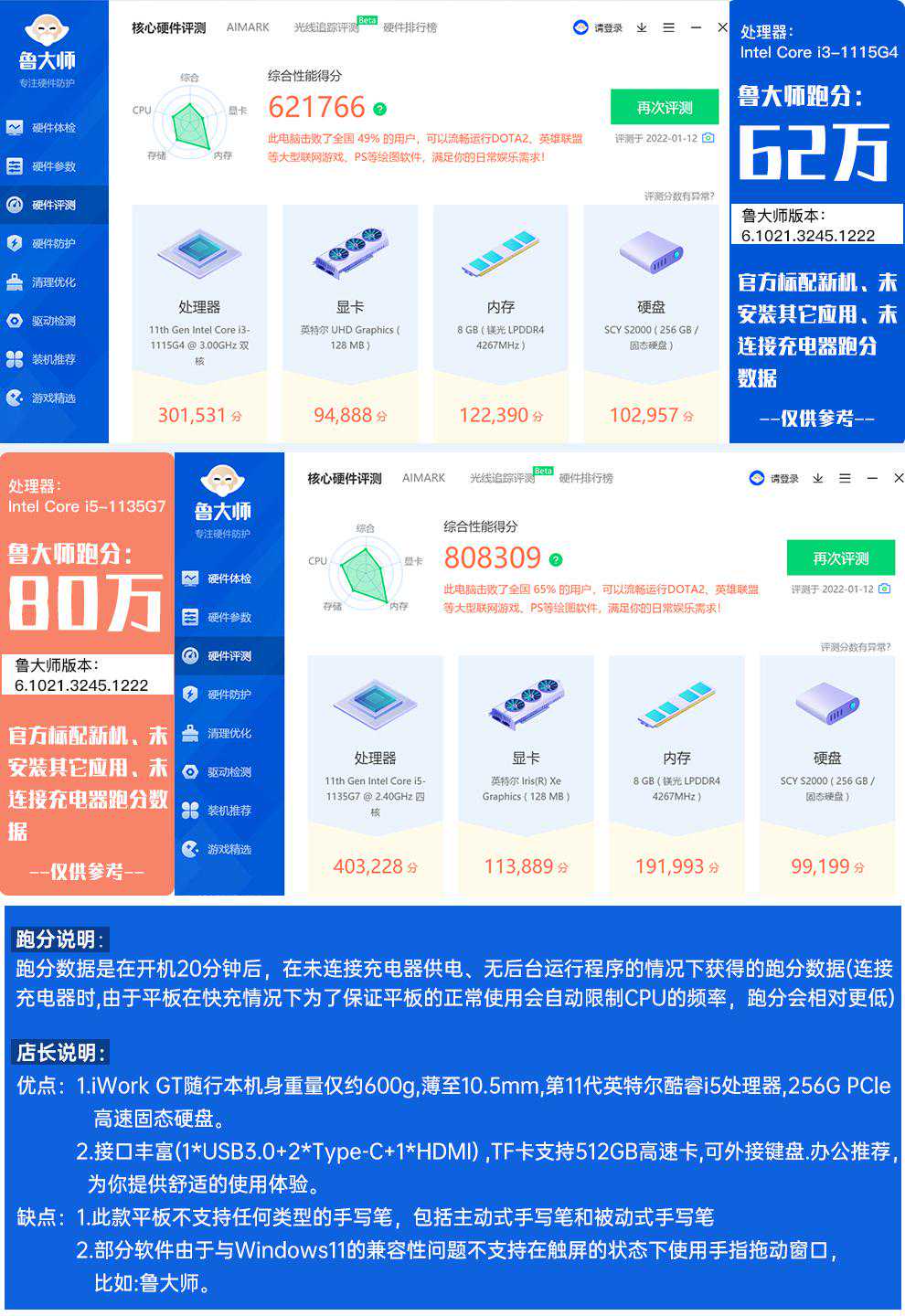 IT之家了解到,酷比魔方iWorkGT搭载了一块11英寸全贴合屏幕,分辨率为2000*1200。配置方面,这款平板搭载英特尔11代酷睿处理器,鲁大师跑分80万,标配8GBLPDDR4内存和256GBSSD。接口方面,这款平板配备了全功能USB-C接口以及MicroHDMI等接口。
