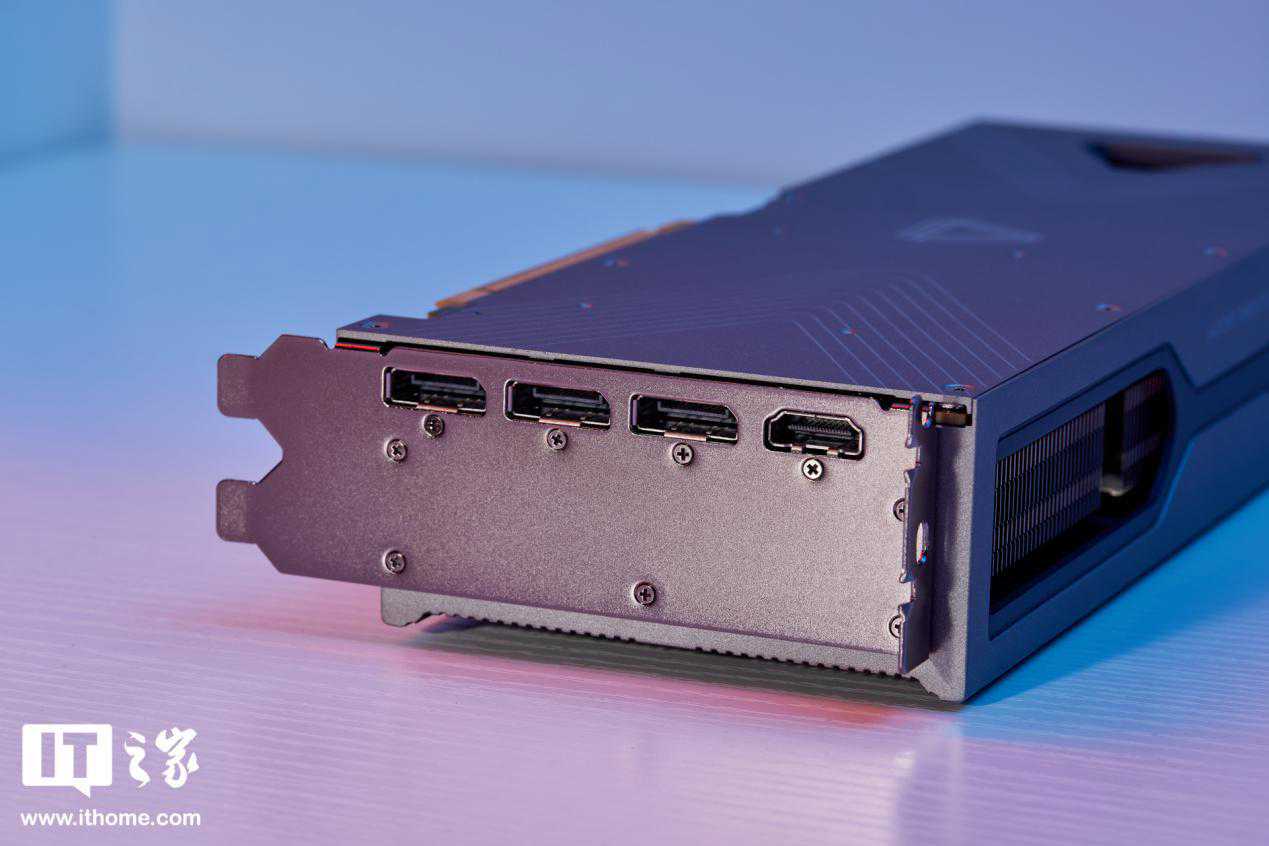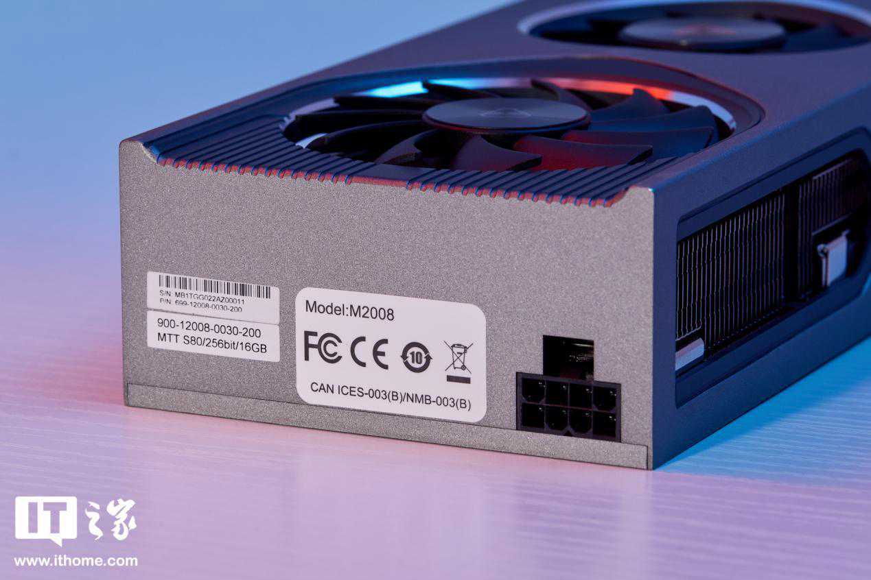 背板有一整块金属保护,中间有一个摩尔线程LOGO,右侧通风孔在通电后还会点亮,观感非常酷炫。