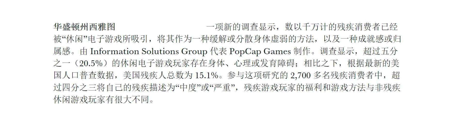 根据Popcap的一项调查报告,全球超过五分之一(20.5%)的休闲电子游戏玩家存在着包括身体、精神障碍等方面的问题;根据美国人口普查数据,这方面用户占社会面的比例也有15.1%。