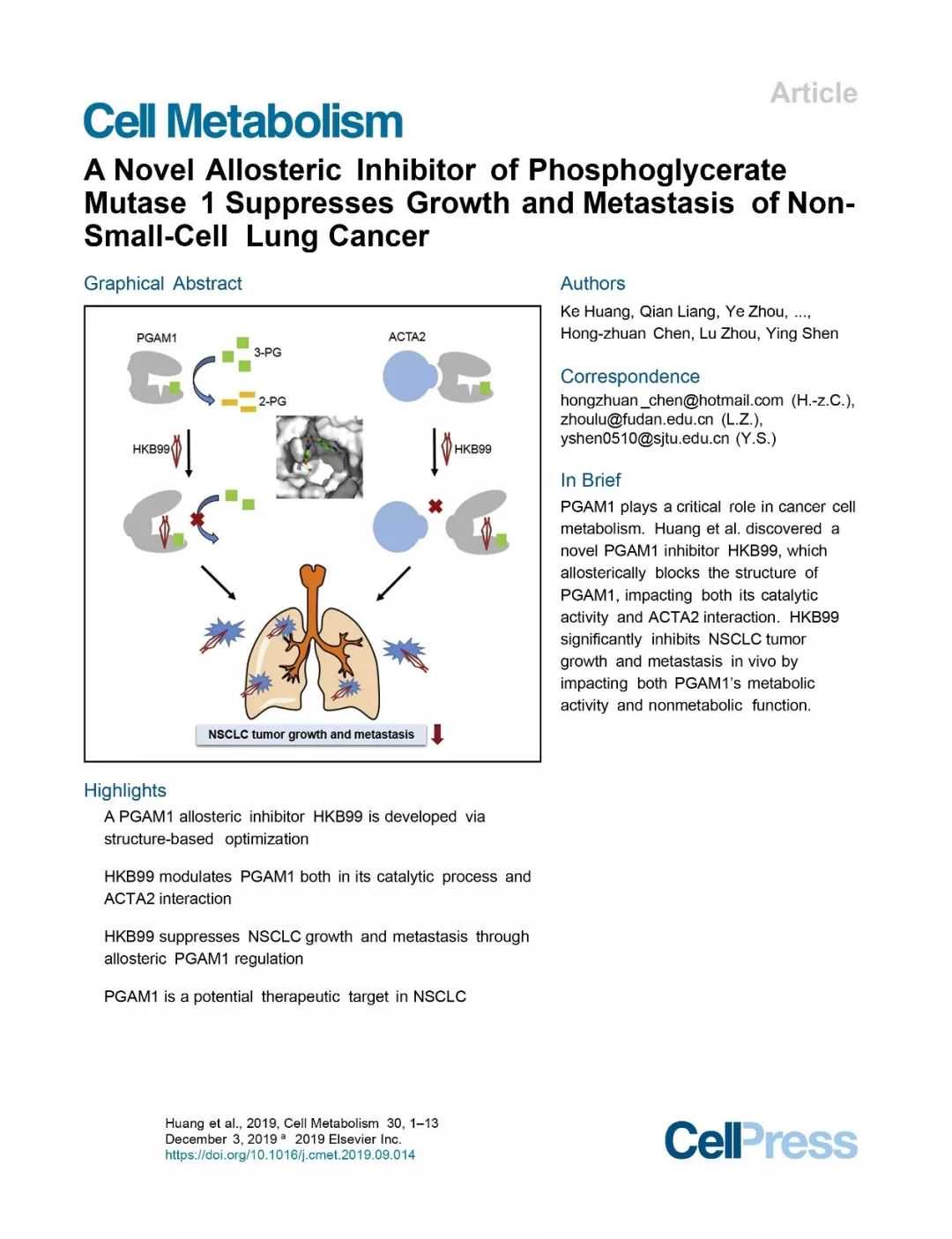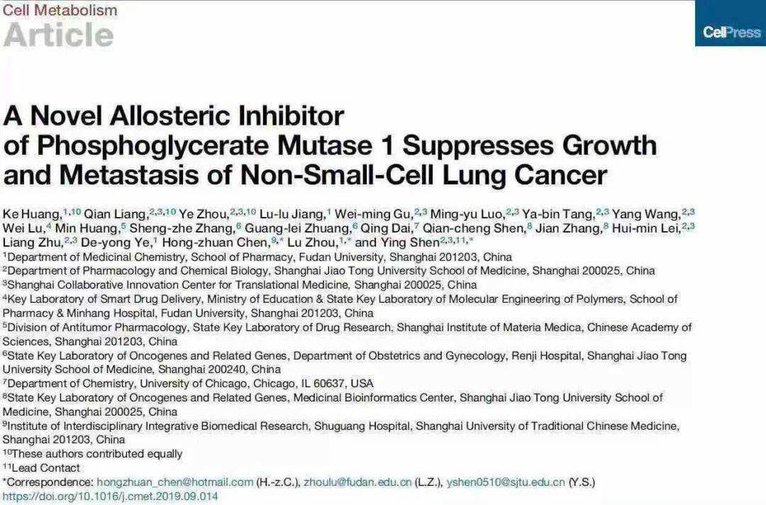 10月10日,上海中医药大学陈红专教授团队在国际顶级学术期刊《CellMetabolism》(最新影响因子22.415)在线发表长篇研究论文,题目为《PGAM1新型别构抑制剂抑制非小细胞肺癌生长和转移》(Anovelallostericinhibitorofphosphoglyceratemutase1suppressesgrowthandmetastasisofnon-smallcelllungcancer),揭示靶向磷酸甘油酸变位酶1(PGAM1)的新型小分子抑制剂对非小细胞肺癌增殖和转移等表型的别构调控机制。