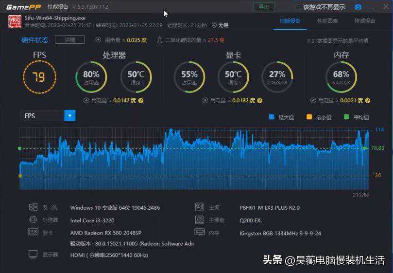 测试下来,因为《师父》这款游戏对硬件要求的比较低,我们可以在1080p中等画质下实现平均79帧率的表现,完全是畅玩状态。