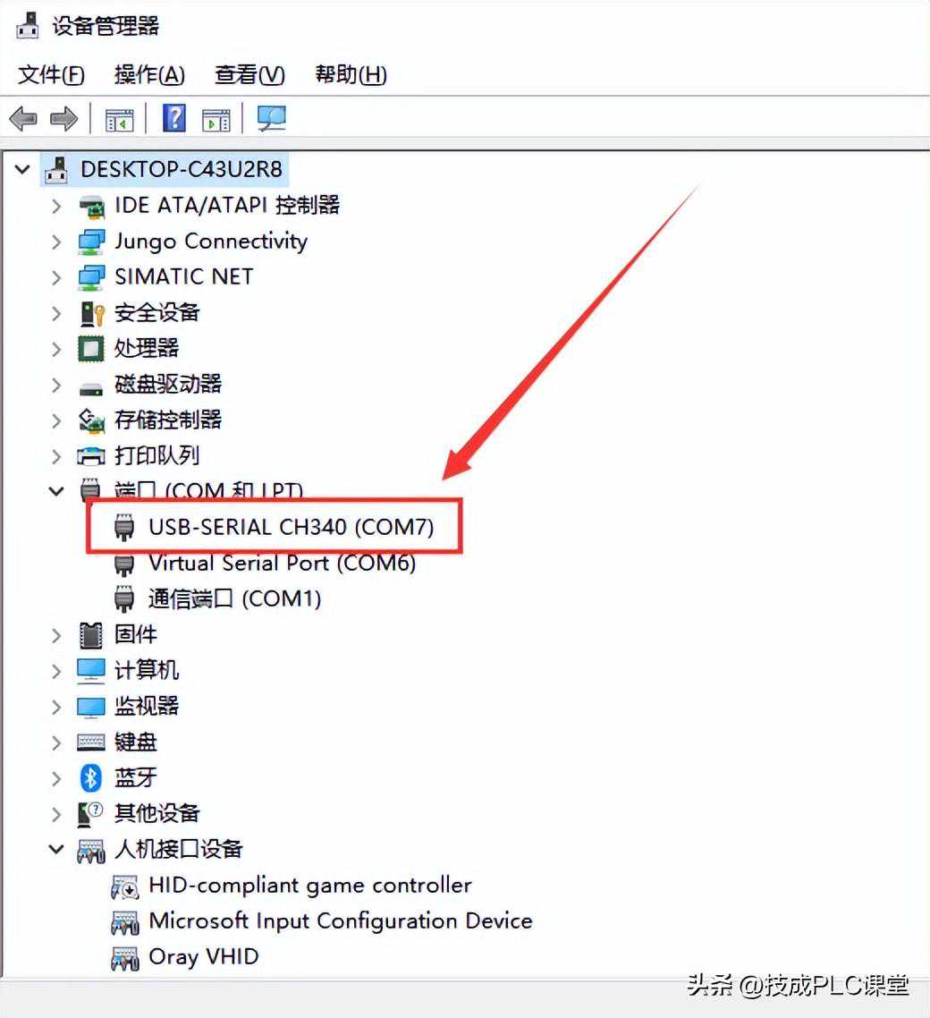 打开电脑的设备管理器查看电脑与变频器通讯的COM口,本案例为COM7;