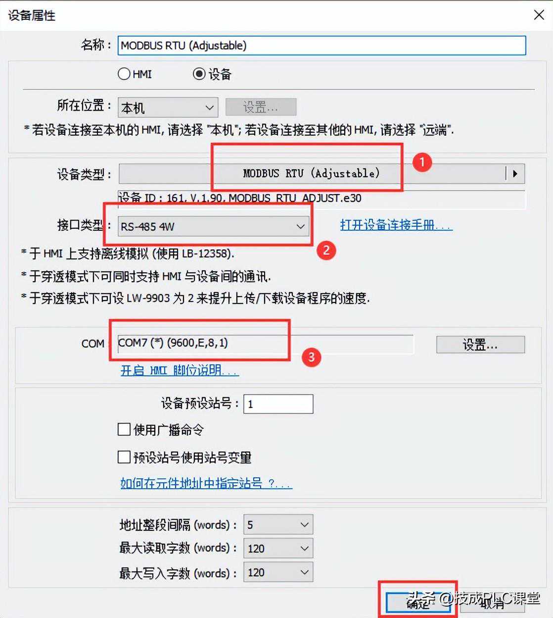 设备类型选择MODBUSRTY(Adjustable),接口类型选择RS-4854W,COM选择COM7,并且通讯参数与变频器保持一致,波特率9600,偶校验,8位数据位,停止位1位;