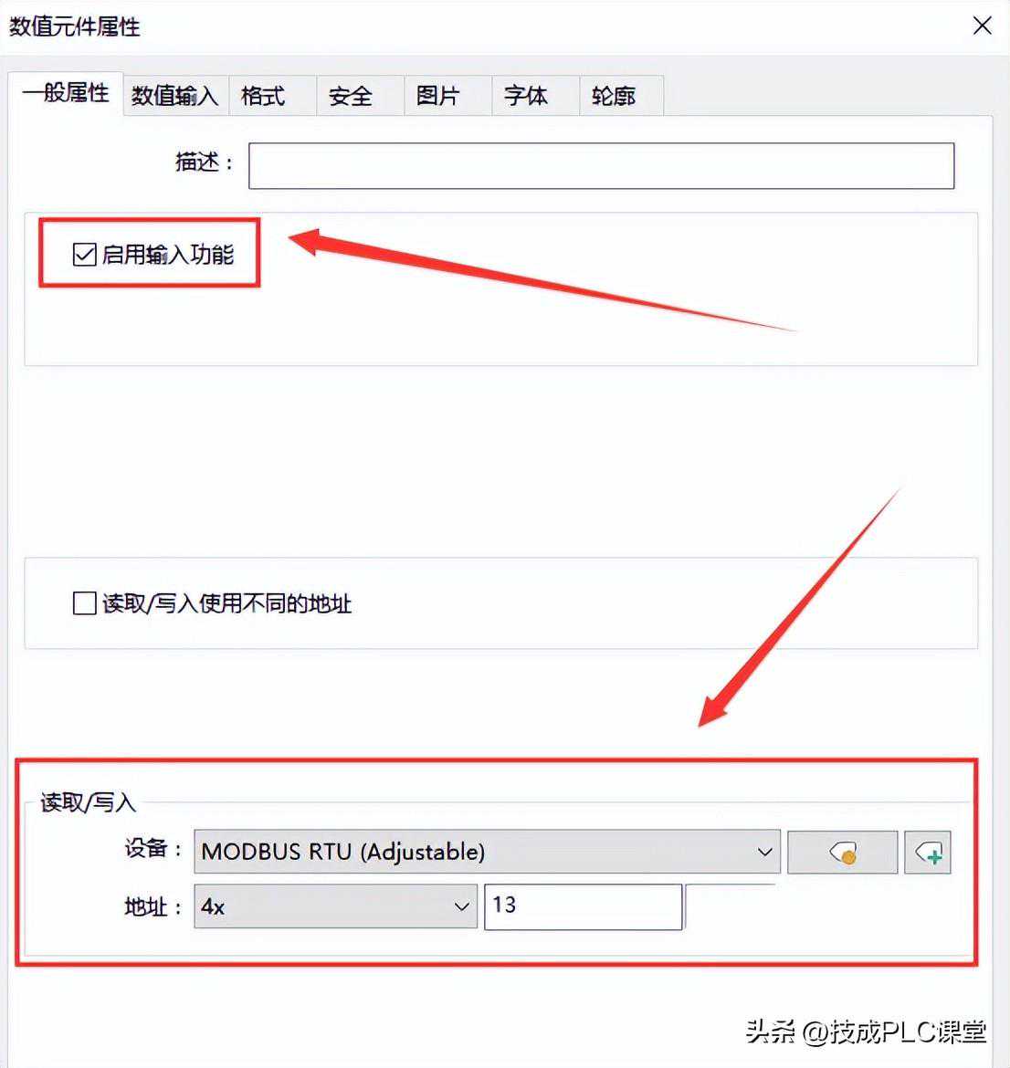 新建数值元件,勾选启动输入功能,地址选择4X13,代表频率写入功能。