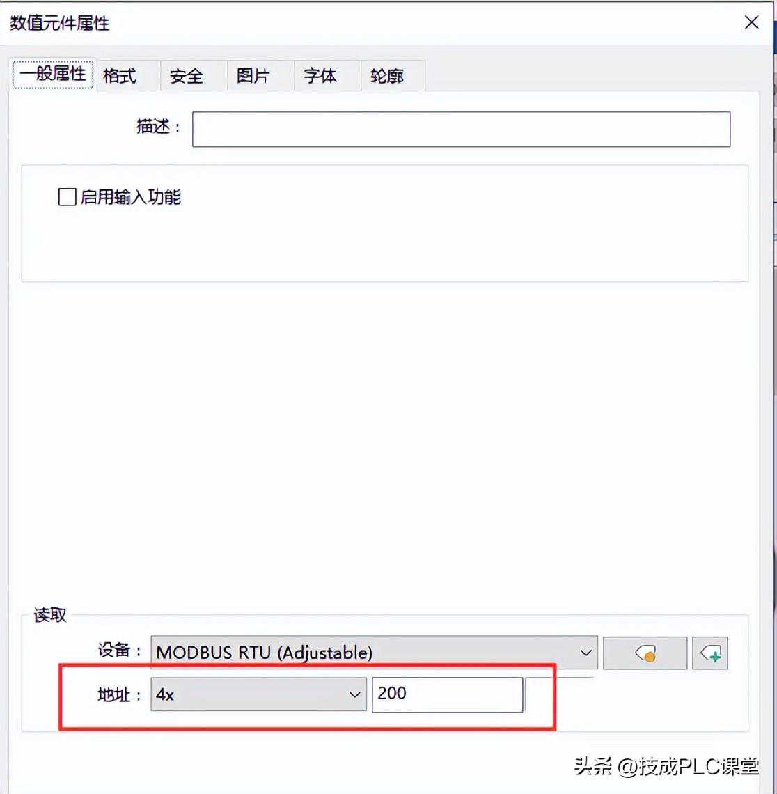 新建数值元件,地址选择4X200,代表输出频率显示。
