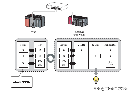 起始模块是指,用于将MELSEC-L系列的输入输出模块以及智能功能模块连接到CC-LinkIE现场网络中的模块。起始模块可以作为CC-LinkIE现场网络的智能设备站使用。