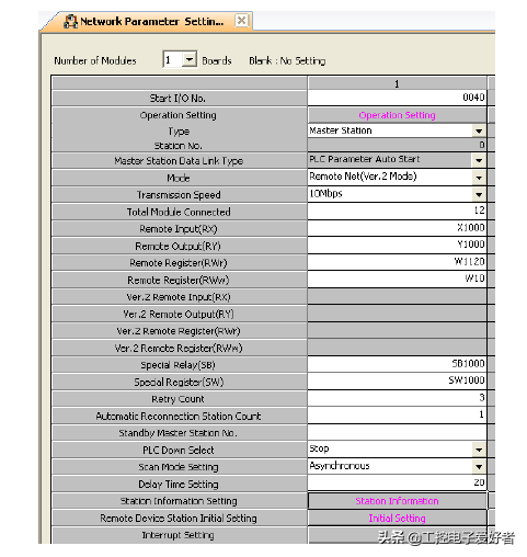 对起始模块上安装的CC-Link主站·本地站模块进行设置。工程窗口[Parameter(参数)][NetworkParameter(网络参数)][CC-Link]。