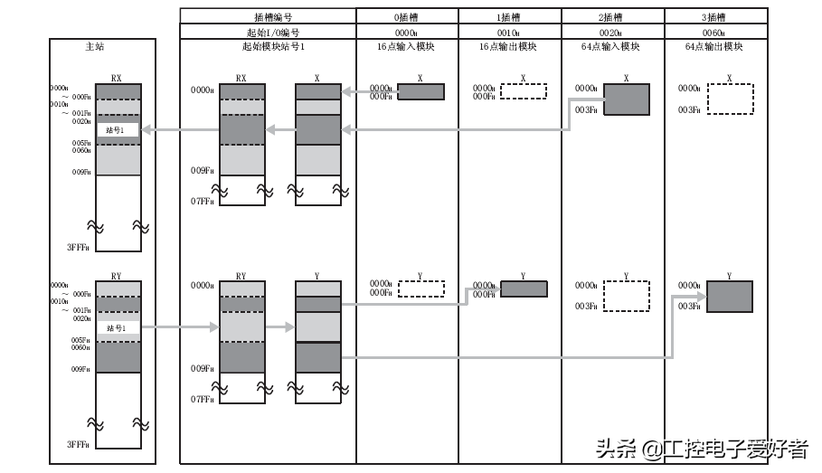 将起始模块上安装的各模块的输入(X)的数据,输出至主站的远程输入(RX)中。